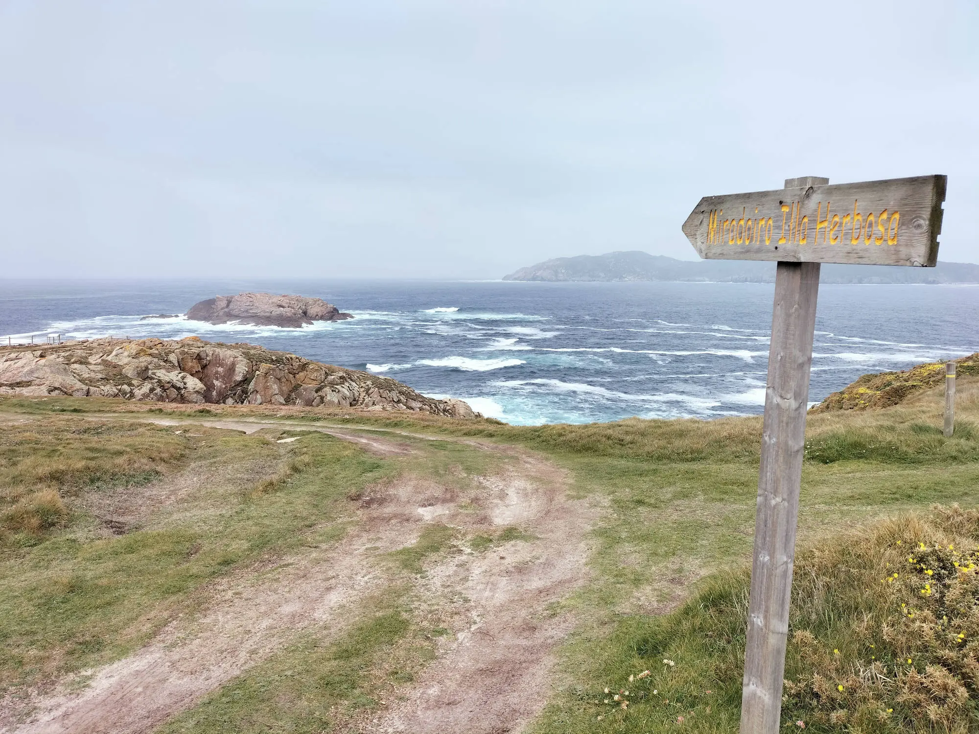 La opción señalizada, pegada a la costa (seguir el track) está muy cerrada por matorral y encharcada (depende de la época por supuesto). La alternativa es seguir la pista de tierra (en el cruce a la izquierda) que pasa entre las dos fincas valladas. En ambos casos llegamos a punta Lavadoiro, donde se encuentra el mirador de las islas Gabeiras: una barandilla de madera, un banco y un panel.