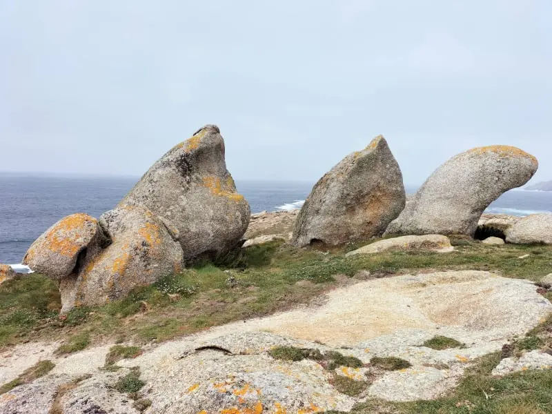 Retomamos el camino principal y continuamos bordeando el litoral, pasando por Os Guilleiros y cruzando el rego de Muíños hasta la punta Herbosa, donde se sitúa otro mirador, e nuestro km 5,5. Tras un pequeño descanso continuamos atravesando un pequeño pinar para acceder a una pista ancha en la que está el útimo mirador, el de la punta de San Xurxo, este enfilado en dirección a la playa, a la que llegamos en breve. En total llevamos 8 km cuando pasamos entre las casas-casetas que preceden al arenal.
